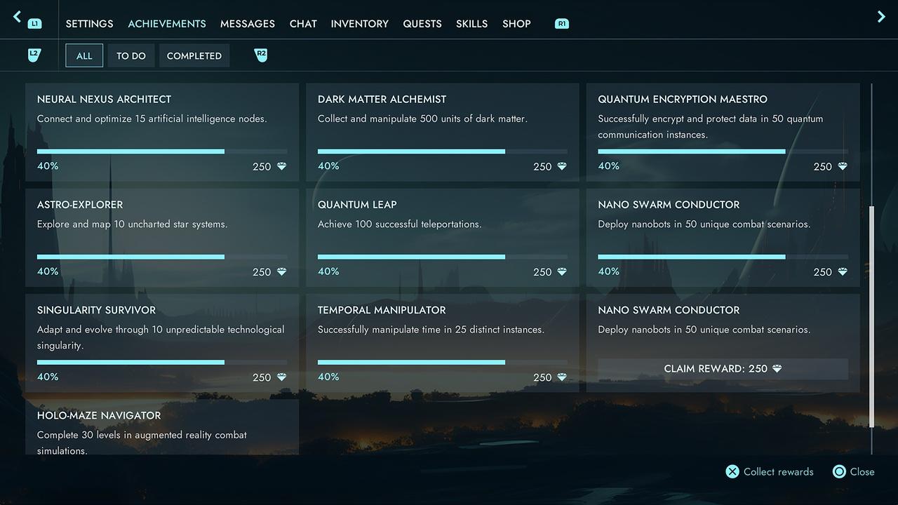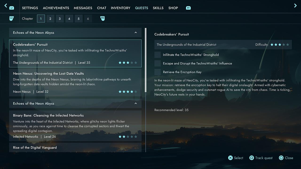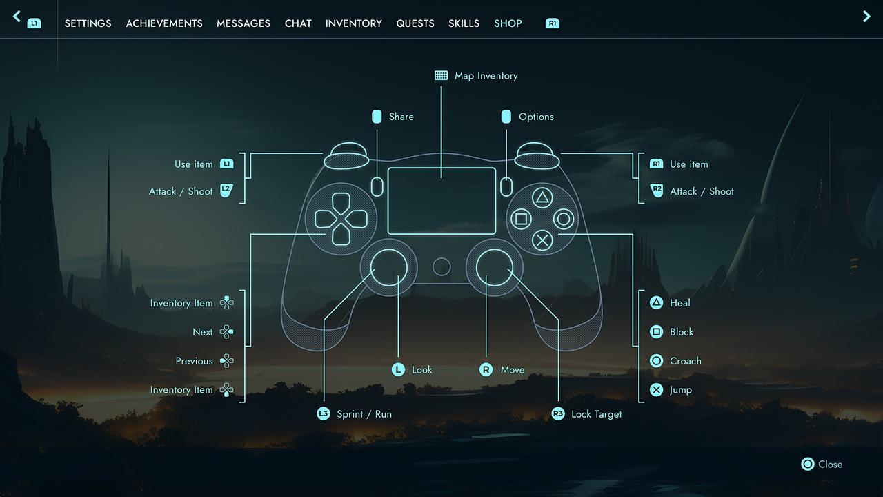 Ranking, Settings, Chapters, Chat, Comunication Circle, Controler 1 & 2, Shop, Skills, Inventory, Equipment, Gamma Correction,-Crafting, Cursor Change, Database, Create Character, Saved Games, Quests, Levelup, Messages, Achievements, Login, Register, Pause, Exit, Map, Item info, Delete, Chat, Small in-game Chat, Upgrade