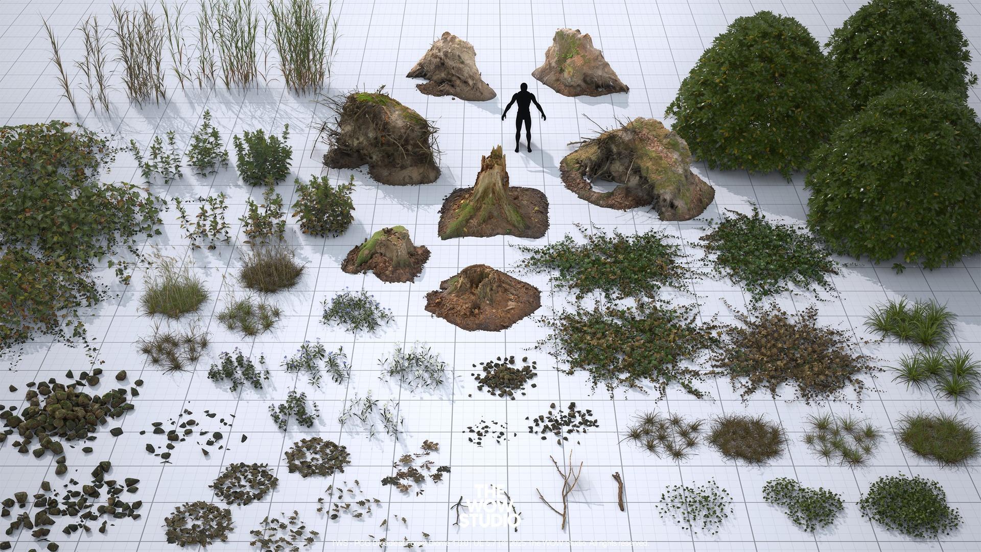 Foliage, debris, rocks, and roads are carefully crafted photogrammetry models which are nanite by default. Full geometry models, no masked or opacity materials.