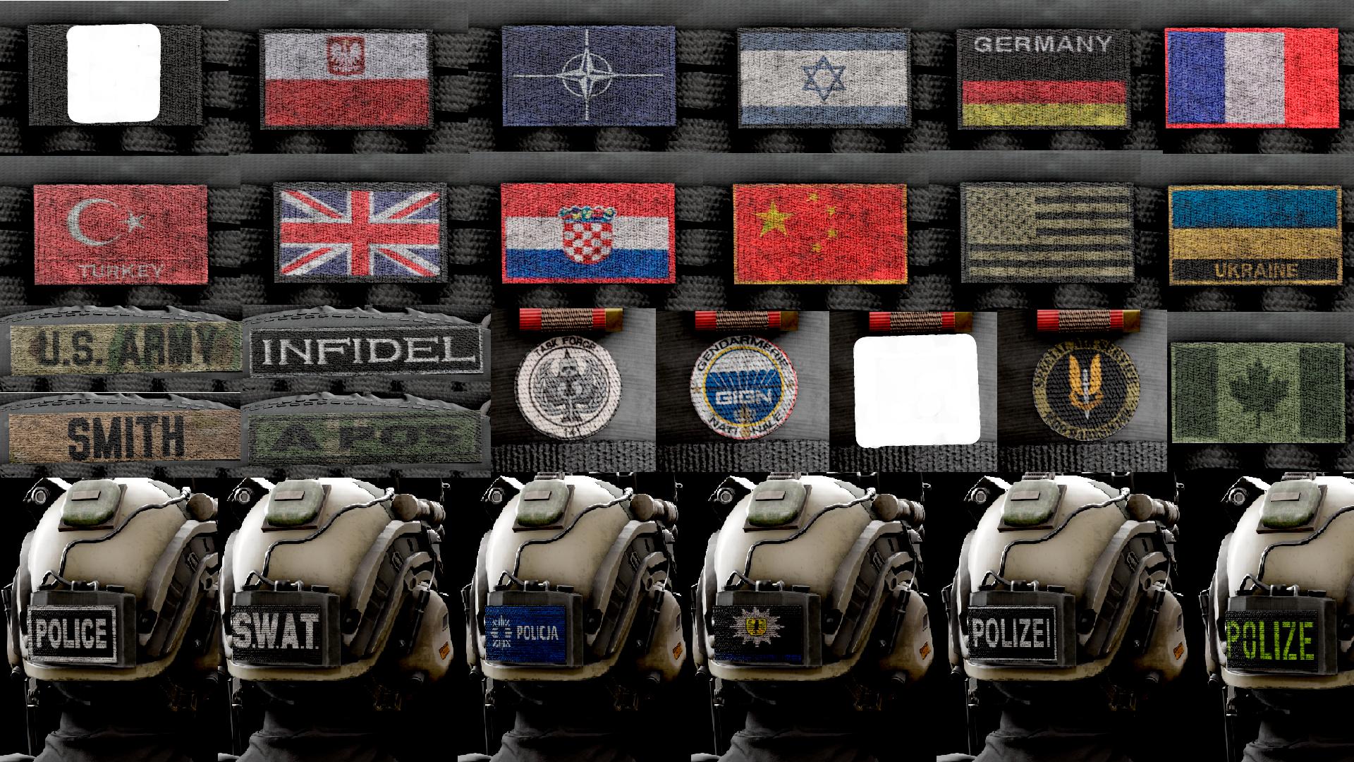 13 different variations camouflage(camouflage of different countries14).Including flags and chevrons of different countries.