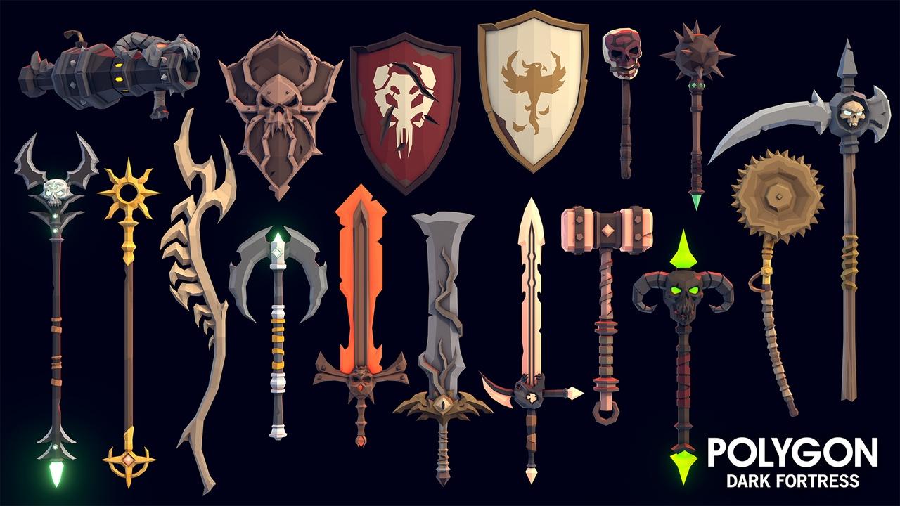 Swords, staffs, shields, hammers, clubs, cannons, scythes and axes.