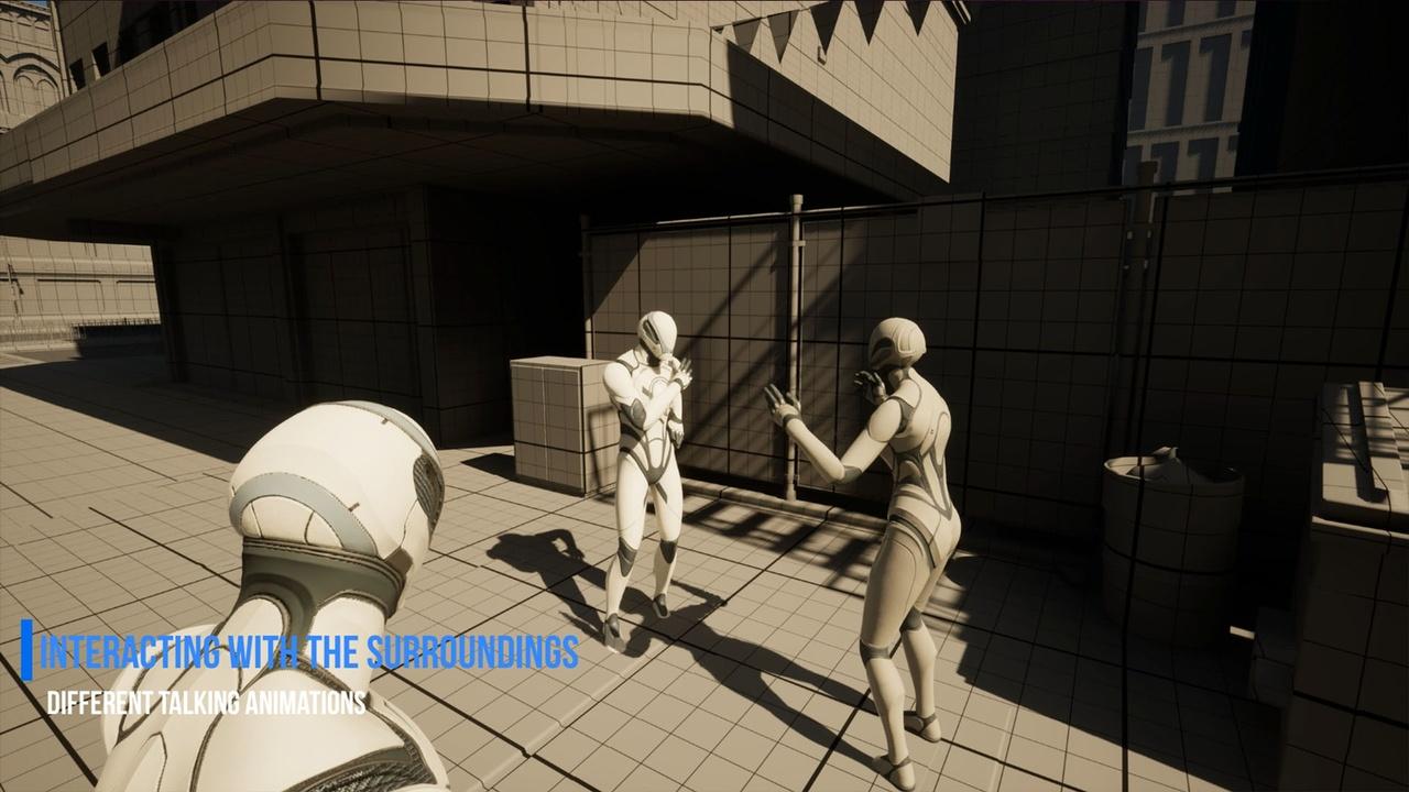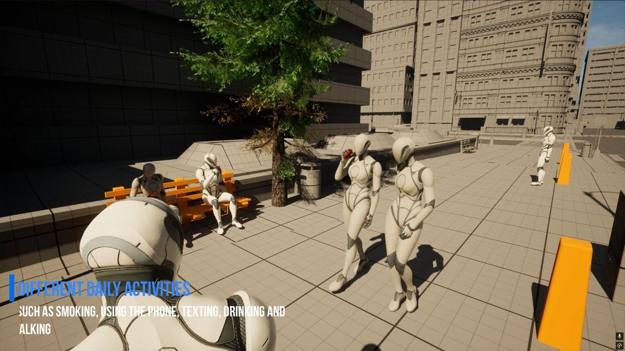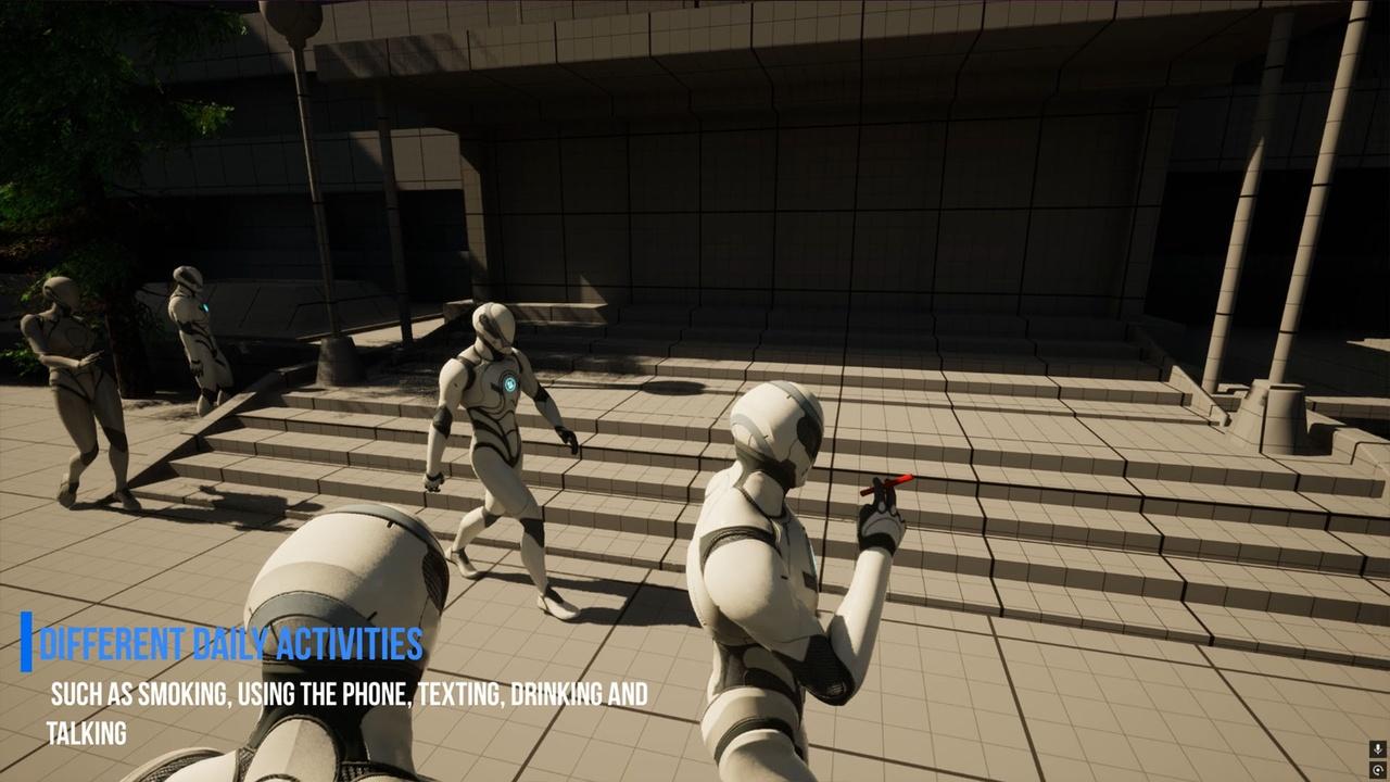 NPCs interact naturally with the environment while walking, standing, or sitting. They can perform everyday activities such as using phones, smoking, chatting with other NPCs, drinking and more, All props, such as phones, and drinks,etc.. can be replaced with the user own meshes, allowing full customization and integration into any game.