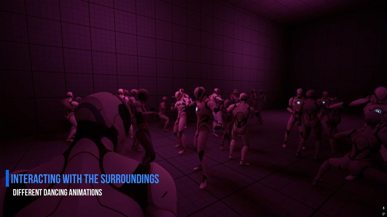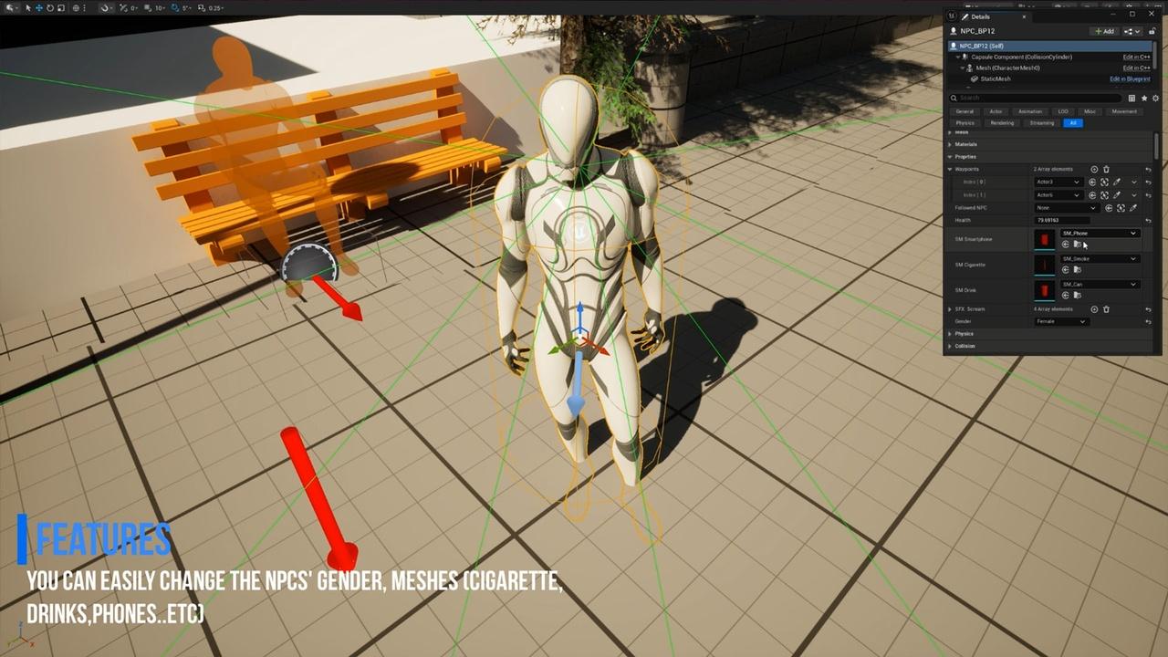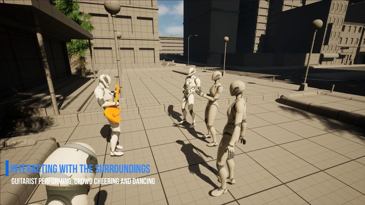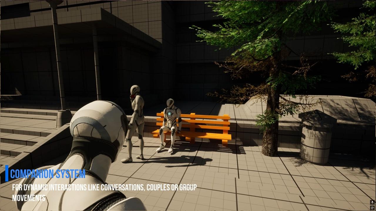 NPCs interact naturally with the environment while walking, standing, or sitting. They can perform everyday activities such as using phones, smoking, chatting with other NPCs, drinking and more, All props, such as phones, and drinks,etc.. can be replaced with the user own meshes, allowing full customization and integration into any game.