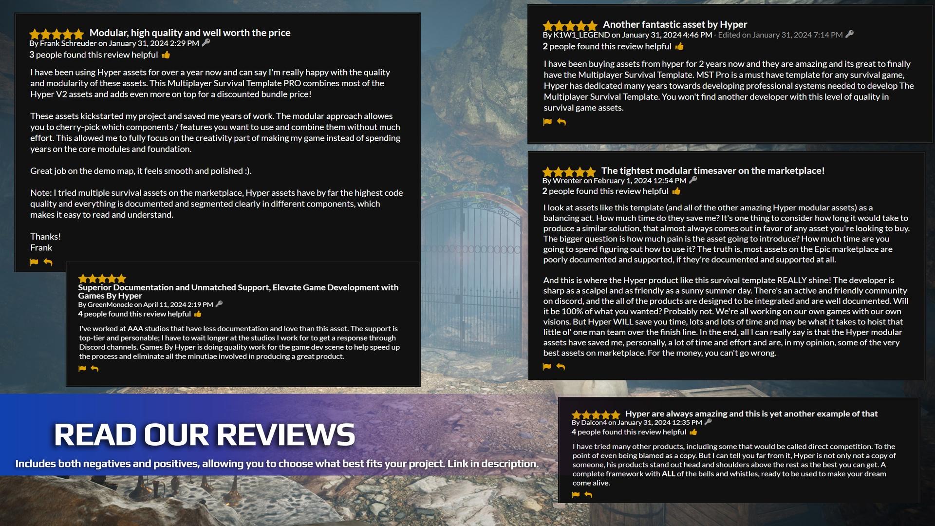 I've worked at AAA studios that have less documentation and love than this asset. The support is top-tier and personable; I have to wait longer at the studios I work for to get a response through Discord channels. Games By Hyper is doing quality work for the game dev scene to help speed up the process and eliminate all the minutiae involved in producing a great product.