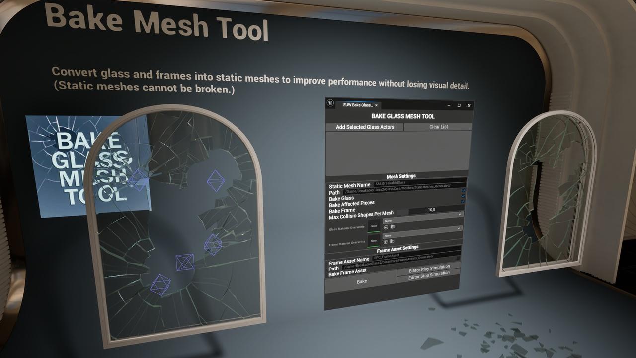 Bake to static mesh – Convert shattered glass into optimized geometry for better performance.